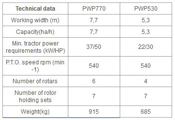 Working width (m): 7,7. Capacity(ha/h): 7,7. Min. tractor power requirements (kW/HP): 37/50. P.T.O. speed rpm (min -1): 540. Number of rotars: 6. Number of rotor holding sets: 7. Weight(kg): 915.