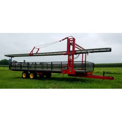 The Proveyor Trailer is a custom harvest conveyor trailer with a hydraulic conveyor that is extended out over the rows of produce. The Proveyor Trailer can be adjusted to as low as 14” from the wagon bed or to as high as 40”. With rails around the edge, you no longer need produce bins, but can place loose ear corn, cantaloupes, watermelons, and/or similar produce in the wagon without them falling off. The conveyor is 28 feet long and has slats every 12 inches. The hydraulics are powered by the tractor`s hydraulic system or a self contained hydraulic unit can be installed.