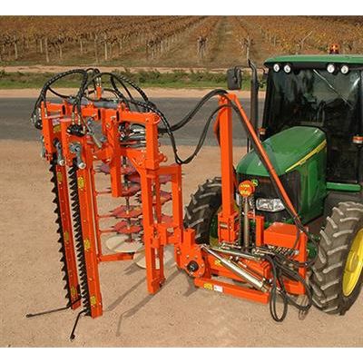 The SG Mechanical Spur Pruning machine with full electric over hydraulic controls allows more responsive tilt, lift, side shift and top head cylinder operations. Operators can accurately set machine to cut precise spur lengths. Patented free spinning discs allow for operation of the pruning machine around posts and Vines.