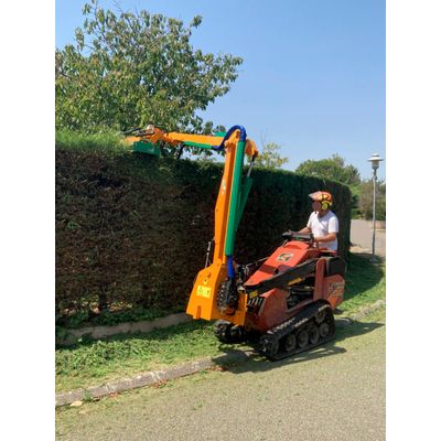 Hedge Trimmer on skid-steer loader. Disc hedge trimmer with a spray-suppression device for the cut vegetation. Its double parallelogram system maintains the trimmer in position. Small and narrow size. Equipped with an offset kit of 40-50cm. Front mounting for better visibility. Intuitive control panel. Paddock stand to store the trimmer and use other tools.