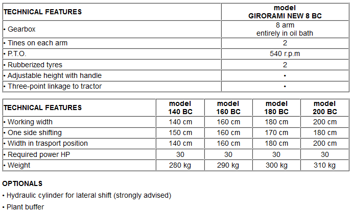 BORELLO NEW 8, pruning rakes make a 50 to 120 cm. wide swath of pruned branches in the middle of the row. This makes shredding or cleaning easier. A shock-absorber (BORELLO pruning rake patent) makes the operation easier. The elasticity of the spring tines permits to work in any kind of orchard whatever the ground. The gearbox parts are in oil bath therefore no maintenance is needed. NEW 8 B.C. model standard frame with pto shaft for espalier orchards only. The tool can be shifted on one side. Possibility of working as far as 200 cm. from the tractor wheel. Welded steel frame that can be displaced either manually or hydraulically so that the rotor can get close to the trees and remove the pruned twigs more easily.