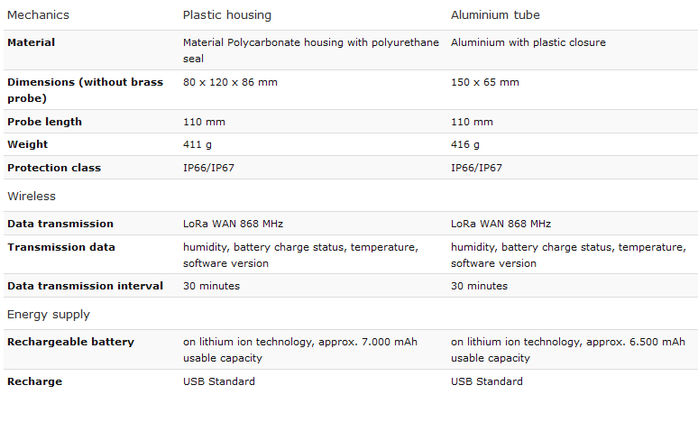 Our sensor is available in a plastic housing or aluminium tube and reliably transmits humidity, voltage, temperature and, if desired, the software version.