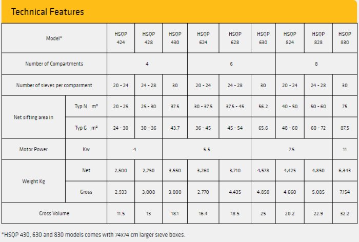 The HSQP Plansifter from Henry Simon is engineered for the sifting and grading of grinded wheat, maize, and various other grains, such as barley, rye, and spelt. It is also versatile enough to handle granular and powdered foods like tea, malt, coffee, and lentils. Built with leading Advanced Sensor Technology, this machine allows users to monitor environmental conditions and analyze data for optimal operation. The unit features a specially designed chassis suitable for vibrating operations, enabling it to hold up to 30 sieves per deck with larger G-type sieve boxes. The HSQP models 430, 630, and 830 are equipped with 74x74 cm sieves, ensuring high capacity in limited spaces and facilitating easy cleaning and maintenance. Henry Simon's rich legacy in grain milling technology since 1878 is embodied in the HSQP Plansifter, which aims to combine efficiency with innovative design.Most popular related searches