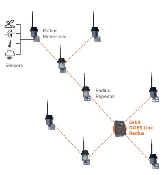 The Orbit GOES.Link Radius acts as a TITAN Radius Gateway. Each Mote/slave provides a wireless SDI‐12 LPWAN bridge between a sensor and a Radius Gateway/master (which connects to data logger or uplink) or a Radius Repeater (extends the network even farther)