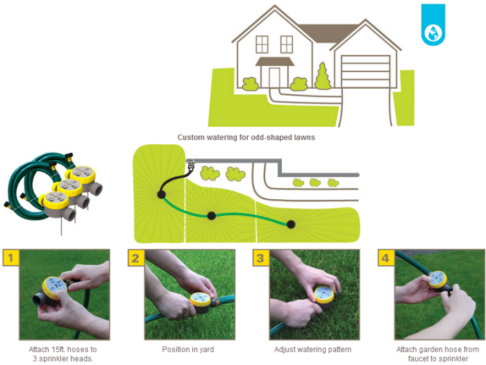 Ideal for narrow strips and oddly shaped, small lawns. Includes two 15-ft sections of ½” reinforced garden hose with plastic couplings, 3 sprinkler heads with fold-out spikes. Each head has 4 adjustable spray patterns, with coverage area adjustment from 6 feet to 30 feet. Easy set-up, roll up.