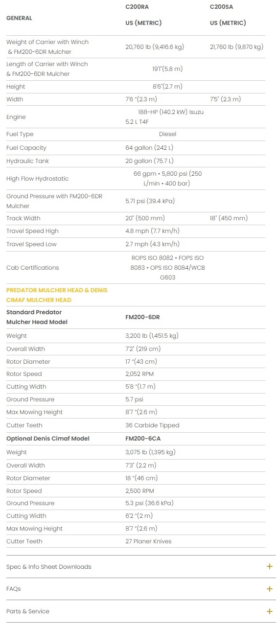 For the ultimate in compact, powerful mulchers, look no further than Rayco’s C200. Its narrow profile makes the C200 the ultimate for ROW clearing on narrow lines as well as for use in larger-scale clearing projects. The operator cabin is comfortable and spacious, with a high-backed, heated seat with air-ride suspension. The rear fan is auto-reversing, reducing maintenance time.