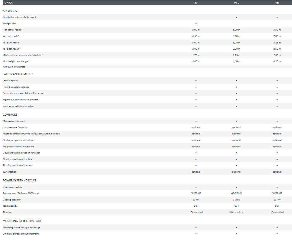 The Tonica range of reachmowers offer unequalled user comfort for the operator thanks to thecombination of left-hand pivot and the arm cranked towards the front.