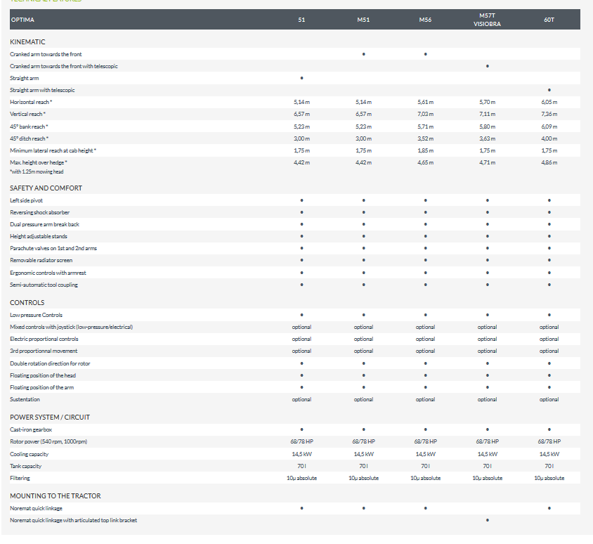 Designed for more intensive work rates, the Optima range is the first to feature the patentedVisiobra concept which offers comfort and work security without precedent.Very highly regarded by regional councils and local councils the Optima boom mower operates exceptionally well on all tasks(mowing, shredding, sawing). It features safety devices developed by Noremat such asthe recoil shock absorber and the double pressure break-back.