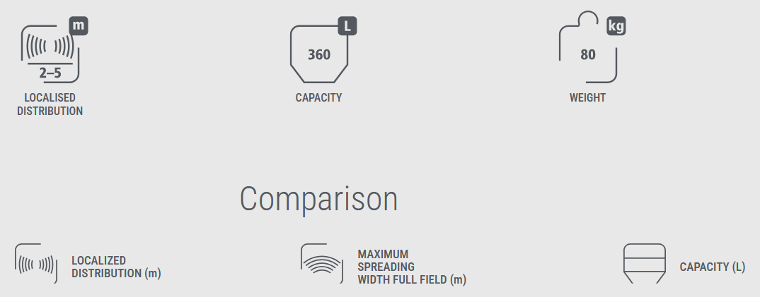 Eurospand`s entry level for localized fertilization. Spreader for bilateral localized distribution on vineyard and orchard rows. Working width from 2 to 5 m. Hopper with capacity of 360 litres made in a single piece without welding. Frame with first category hitch.
