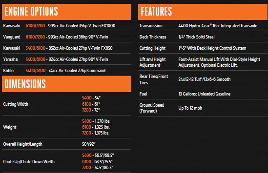 Dual High-Performance Hydro-Gear 4400 Integrated Drive System for reliable, self-contained power and performance. Front I-Beam rail with steel 1/2˝ front forks lead the industry in strength and durability. Available in five engine options and three deck sizes to fit most applications.