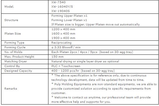 The reciprocating egg tray/carton machine is mainly applied for producing egg trays, egg packaging cartons, fruit trays, drinking cup carrier trays, bottle trays and all kinds of ordinary industrial packaging products and so on. Pulp molding production line with reciprocating egg tray/carton machine as the main system has the following features: