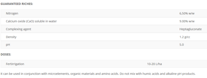 Calcium source fully active and easily assimilable by the plant, formulated based on polycarboxylic acids. Reduces Electrical Conductivity (CE) and Percentage of Interchangeable Sodium (ISP). Corrects problems associated to the excess sodium, chlorine and magnesium ions in irrigation waters.