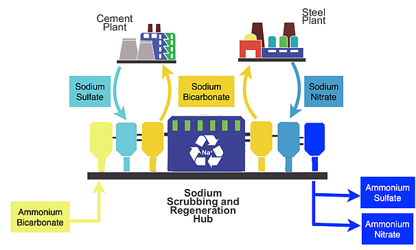 - The pollution is trucked to the Hub from the connected facilities, where the sodium is recycled and the sodium sulfate and sodium nitrate is converted to sodium bicarbonate (baking soda), ammonium sulfate and ammonium nitrate (fertilizers)