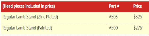 This stand is ideal for lambs/kids and smaller sheep and goats. This stand is designed to hold an animal up to about 250 pounds. The stand has adjustable legs, can be set up square or at an angle and when finished, it folds up flat to carry and for easy transport. Head piece is included in price and is zinc plated.