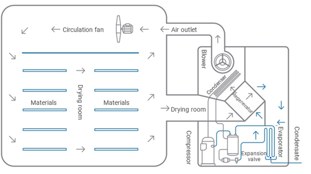 Air flow: heating by hot air in the drying room, the material absorbs heat and water vaporizes, the air absorbs moisture into hot and humid air → enters the evaporator, the air is cooled to below the dew point temperature, the water vapor condenses and releases the latent heat of condensation → enters the air condenser to absorb the refrigerant and release it during condensation Heat heating air → main fan → drying room.