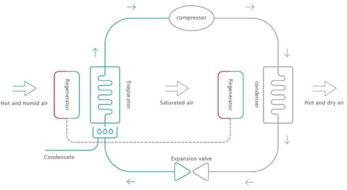 Dehumidification heat pump = combination of dehumidification (drying) + heat pump (energy recovery),which is a device that is to make humid air cool and dehumidify by refrigeration system while recovering moisture through heat pump principle to condense latent heat to heat the air. Heat source = The phase change of water vapor in the air releases condensation heat. Closed drying at low temperature (7-75?), and energy recycling during the drying process.
