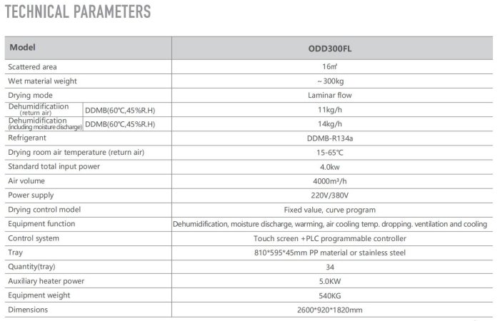 The whole can be moved at will. Use electricity only, plug and use. Closed dehumidification drying mode: Not affected by the weather and region, low heat consumption, no waste heat emission, low noise (less than 50dB). (15-65?)Medium low temp. drying: High temperature and low humidity dehumidification technology. Dehumidification performance ratio:3.5KG.H2O/KW.H: Double-effect and triple-effect dehumidification patented technology. Closed dehumidification is more efficient and energy-saving.