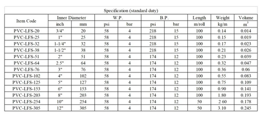 The PVC lay flat hose is also known as the discharge, pump, and lay flat hose. It is designed to deliver water, mild chemicals, irrigation, minerals, construction fluids, and industrial and agricultural liquids. It is reinforced by a continuous, circularly woven polyester strand with high tensile strength. The PVC layflat hose is simple to roll up, store and move. Working Temperature: -5? ~ 65 ? (- 23°F – +149°F).