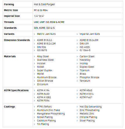 Browse the page for information on jam nut manufacturing process, forming method, available sizes, sub-types, thread types, metric and imperial dimension standards, weight charts, torque values, material categories, grades and astm specifications.