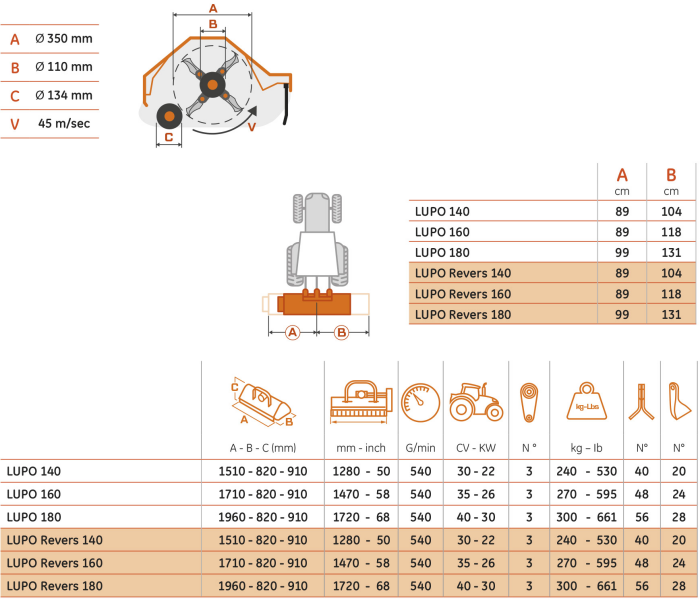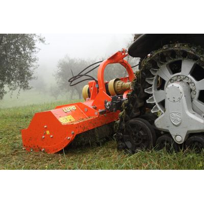 Reversible flail mower for wet soil. Mulcher specially designed for compact tractors, ideal for shredding grass and vines up to 3 cm Ø. The machine enjoys the ability to quickly transform from normal or reverse, simply by changing the transmission. The particular shape of the body which allows the machine to be used both in self-cleaning roller mode and in roller scraper mode to adapt to wet soils. Available in the versions: 140-160-180. LUPO REVERS: 30 – 40 CV.