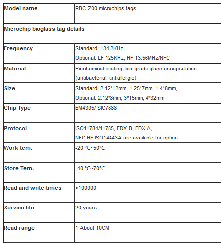 Raybaca - Model RBC-Z00 -Rfid Microchips Tags Glass Tags