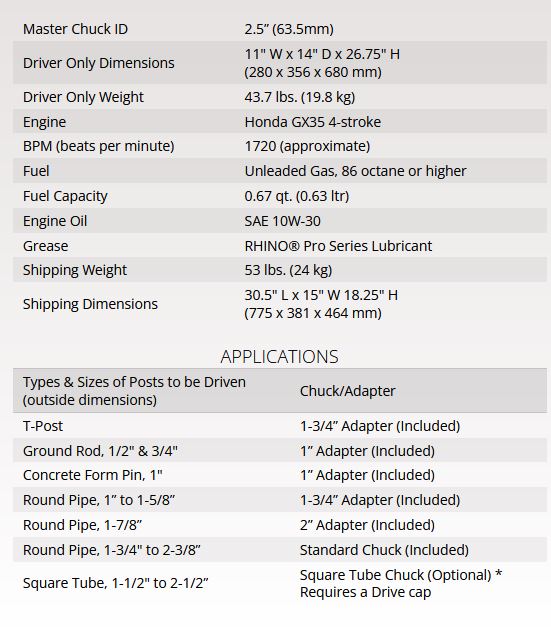 The Rhino Multi-Pro Gas Post Driver powered by a Honda GX35 4-cycle engine, is engineered with increased driving dynamics to drive larger posts and the versatility to take on more post driving applications.