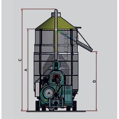 Capacity: m³ 16,5. Capacity: t 12. Height during transport: m 4,98. Height of cylinder: A m 4,98. Operating height: B m 5,55. Operating height with dust aspirator: C m 6,05. Height of outlet chute: D m 3,70. WIDTH: m 2,50 . Length: E m 4,93 . Length with 2,60m. loading hopper: F m 8,14 . Lenght with loading auger: G m 7,30. Fan: m³/h. 35. Burner: Kcal/h 650. Output: t/24h. 60. PTO input: hp 55. Electric engine: kw 30.