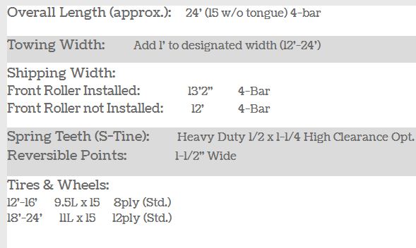 The Parma® Rollaharrow comes in various sizes ranging from 12ft to 24ft in a rigid frame. The 4-Bar units come standard with four rows of heavy duty S-Tines properly spaced to allow optimum tillage without trash buildup and plugging. Also among the standard features is a hydraulically controlled leveling bar to smooth and level the soil behind the S-Tines. The Parma original `wheel forward` axle design with 12-ply tires lifts the front end first to provide better balance for quick lifting and smoother operation in turnaround and transport. The `loose fit` style front and rear packer rollers are available in various sizes and cast steel ring composites. Also available are crowfoot rollers and welded pipe rollers all mounted on large 2 3/16` shafts and triple-lipped sealed bearings.