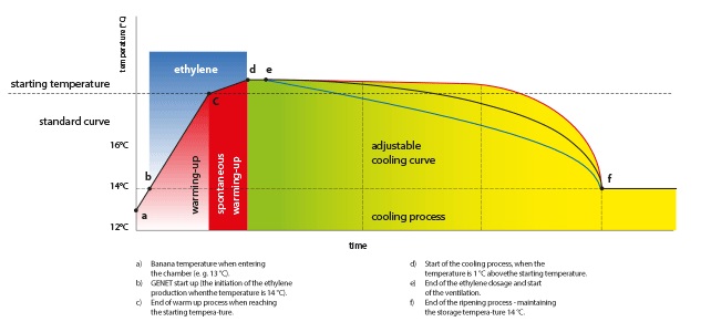 These conditions initiate the biochemical reactions in the fruit. The next days temperature is gradually decreasing and active ventilation is applied. The temperature curve depends on the number of ripening days. The final temperature should be around 14°C and kept until, during and after further distribution to preserve the high quality of final product.