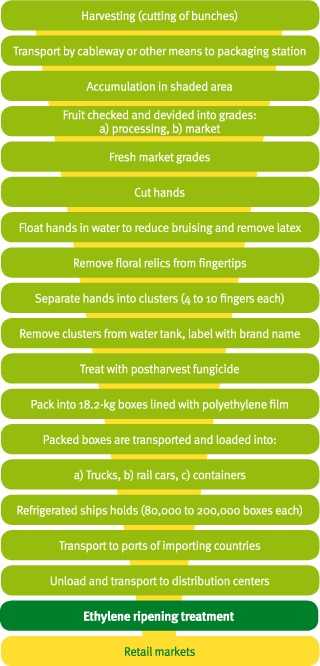 From a botanical point of view a banana plant is a grass, but as tall as 4 meters. The corm of a plant emerges a shoot, and in 1 year the plant flowers. Developing of a bunch takes up to 4 months. It is harvested mature, but not ripen. That is, the fruit is not edible at harvest time: it is very firm, contains latex and the flesh is high in starch. Cut off bunches are then transported from the plantation to the packaging house. The first operation there is inspection and dividing the fruits into processing and market grades. If a bunch is chosen to be marketed, it is cut into separate hands and carefully washed in special pools with additions of fungicides. Clean hands are inspected again and cut into clusters of 4-10 fingers each and labelled with brand name. The last step in the packaging house is packing bananas into character 18 kg boxes and cooling to 14°C. Now bananas are ready for their transoceanic journey. All these operations from a plant to a ready-to-go box should be performed over 48 hours.
