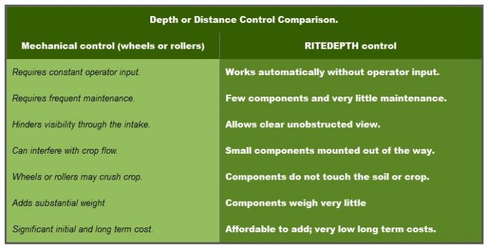Digging depth or topper distance control are among the most important factors in optimising equipment performance and marketable yield. Gauge wheels or rollers are common mechanical devices used to achieve the correct depth or distance. These systems have limited versatility requiring the operator to make frequent on-the-go adjustments. The RiteDepth system automates the adjustments, improving performance and easing operator stress.