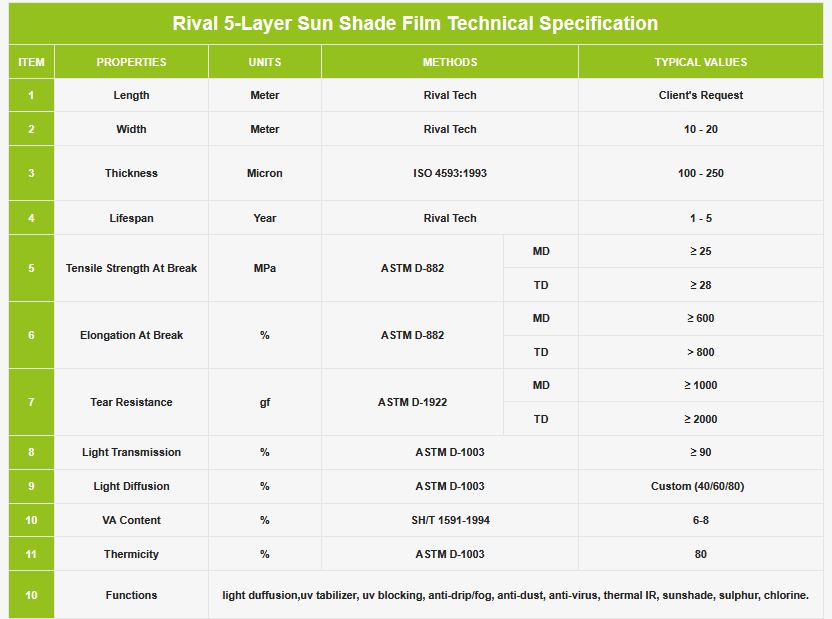 Rival 5-layer sun shade film used in areas of strong sunlight to protect crops from blade burn. Rival manufacturers the greenhouse film at the width up to 20meters and thickness up to 250micron. Multi-functions include anti-aging, anti-drip, anti-mist, anti-dust, and anti-virus. Five main kinds of greenhouse film to meet continents greenhouse requirement, including High transparent film, Light diffusion film, Sunshade Film, Colorful film, and Cooling film.