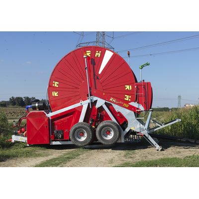 Both the Xj and Xjm range of RM hose-reel irrigation machines feature a structure that can be hydraulically lowered. Therefore, two positions are determined: on wheels to allow its transfer on road or standing on the ground during work phase. The latter position allows the hose to be unwound in any direction - 360° movement - without having to reposition it again. Moreover, the base resting on the ground gives the machinery a high anchoring which is very useful with long hoses with a large diameter.