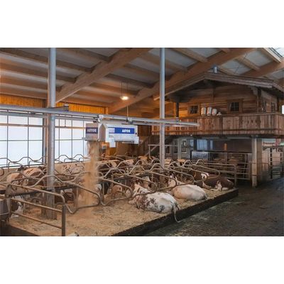The Strewing Robot, suspended from an overhead track, runs silently through the stable strewing the bedding material. It can be programmed to run different routes at set times. While in the parked position, the ASTOR re-charges its batteries.
