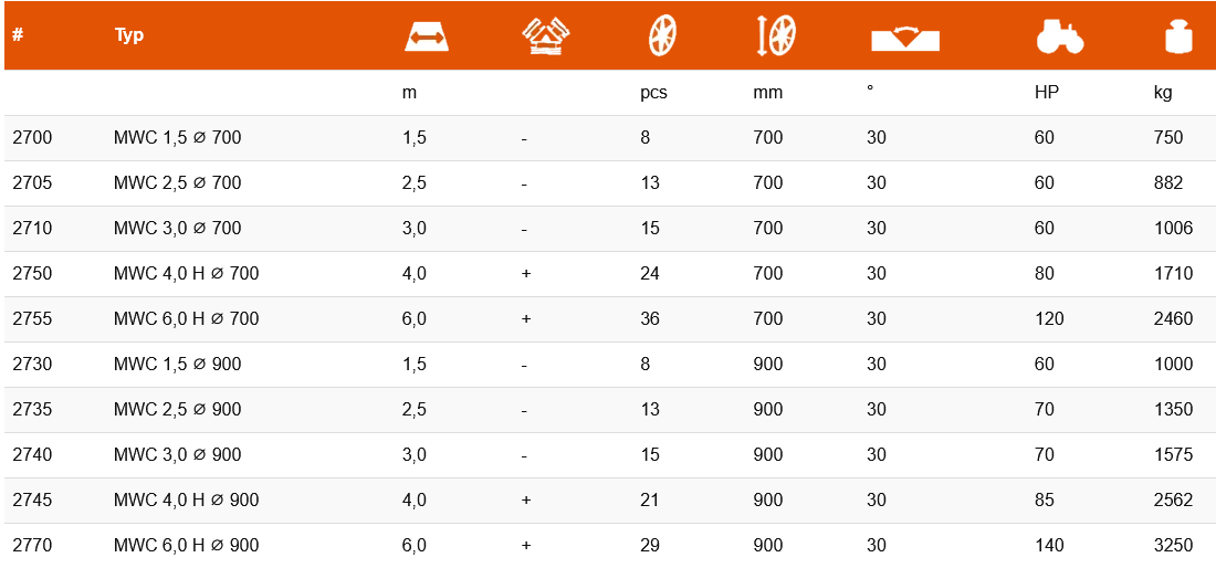 The Campbell MWC/MWW rollers are intended for cultivation. Mounted on the front three-point hitch of the tractor. Their main function is to compact and smooth the field before or during sowing, compress and maintain soil moisture and improve its structure. Mandam Campbell cast wheels are available in three diameters: 700, 800 and 900 mm. Additional, individually height adjusted, knife cultivator section is standard on M WW models.
