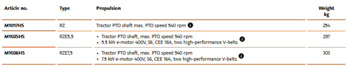 - PTO drive: Only with tractor drive via angular gear and V-belt or in combination with E-motor and V-belt.