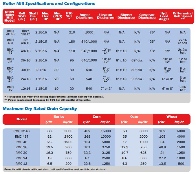 The optional RENN 40% Differential Drive has idler and driver rolls positively driven at two different speeds for optimal particle reduction or high moisture rolling. It is also self-cleaning to prevent plugging. RENN Roller Mills are available in PTO powered trailer or Electric Stationary models, and offer various input, power, and discharge options. PTO models have a minimum power requirement of 15 to 120 horsepower, while Electric Stationary units operate with a minimum power requirement of 5 to 50 horsepower.