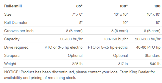 Machine-grooved rollers are available in steel or chrome and can be inexpensively re-machined up to three times if damaged or worn. An optional magnet removes nails and other metal objects from the grain and helps prevent damage to the rollers. An electric motor or PTO drives the 85 and 100. The 180 is PTO driven and can be equipped with 15" wheels to help with transport and a 12` hydraulic discharge auger that swings a full 180 degrees.