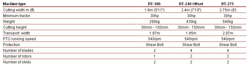 Cutting widths 1.8m/2.4m/2.75m. 2.4m Offset model available. Three-point linkage-mounting. Cutting height from 30mm to 150mm, 540rpm PTO. Shaft driven gearboxes. Shear bolt protection. Two cutting blades per rotor 50mm blade overlap. Full length skids. Free Swinging Blades