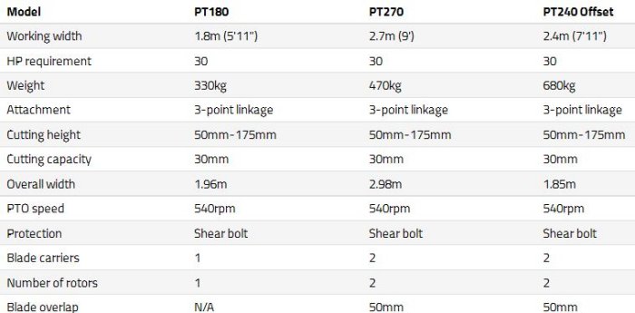 Weighing in at just 500kg, the PT180 is compatible with smaller, less powerful tractors. Its 30hp power requirement is one of the lowest on the market for a machine of its productivity. The larger PT270 and PT240 Offset can both be run on tractors with just 45hp.