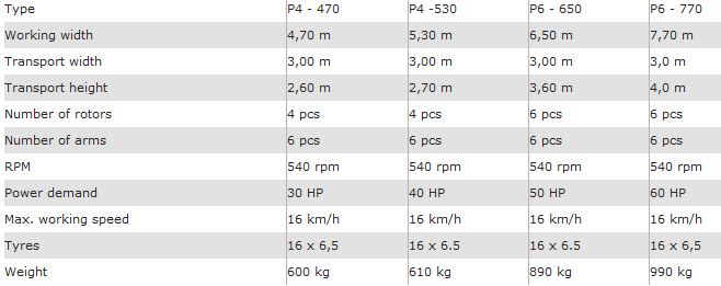 In SaMASZ offer there is six tedder models. Four models with 4-rotors: P 4 - 470 and P 4 - 530, P 4 - 530 C (trailed version) and P 4 - 531, as well as 6-rotor models P 6 - 650 and P 6 - 770. Owing to their high efficiency, quality and durable design, rotary tedders became well-known to the Polish market and are winning foreign farmers’ trust.