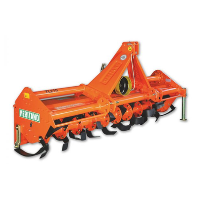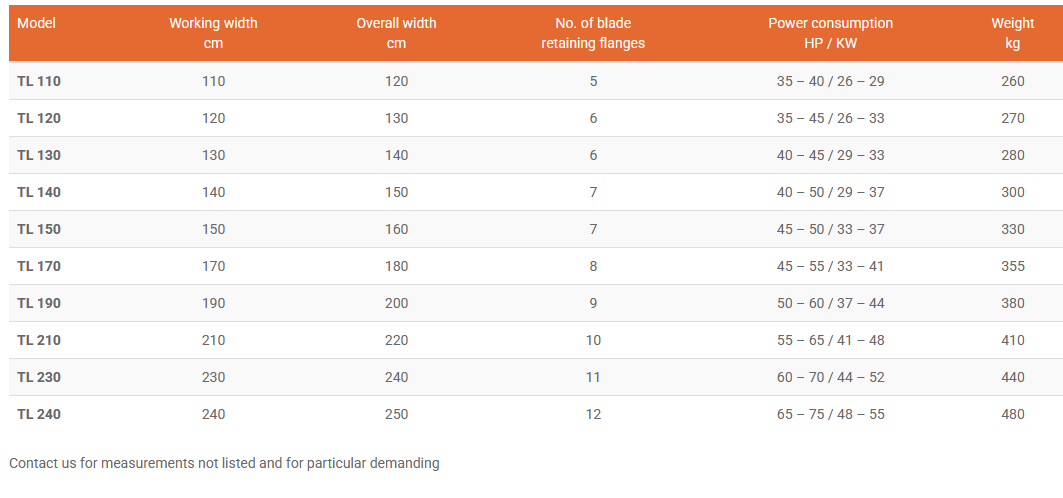 Rotary tiller three point attachment for tractors from 35 to 75 HP - from 26 to 56 KW. Over 50 years experience in the manufacture of rotary tillers enable us to realize a reliable and durable product. On rotary tiller model TL (as on several other models) can be mounted a central box at 1 or 4 speed. Is possible, with the middle box at 1 speed, to optimize machine performance in function of soil type and tractor power to which it is applied, choose the ratio of rotation of blade retaining shaft between 3 different speeds.