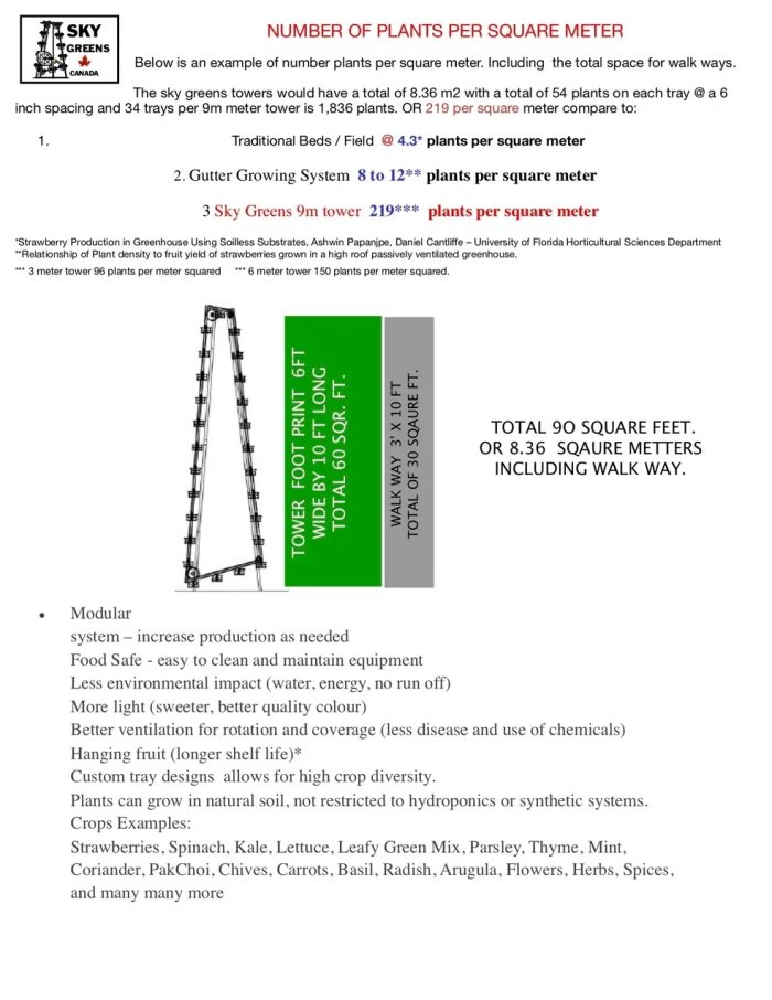 The demand for locally grown fruits and vegetables currently exceeds the supply readily available. By utilizing newer technology, we have the ability to grow a vast majority of our required fruits and vegetables locally ( limiting the need for importation). Sky Greens patented vertical farming systems consist of rotating tiers of growing troughs mounted on an A-shape aluminum frame. The frame comes in three different sizes: 3, 6, and 9 metres in height. It has the ability to house upto 38 tiers of growing troughs, which can accommodate the different growing mediums of soil or hydroponics. The troughs rotate around the aluminum frame to ensure that the plants receive uniform sunlight, irrigation, air flow and nutrients as they pass through different points in the structure.