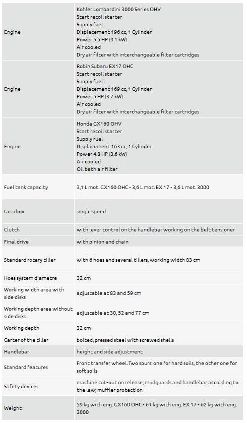 Gear housing in press-formed plate sections secured by bolts. Belts in kevlar (high performance). Handlebar easy to control and fully adjustable. Rotary tiller with 6 hoes plus disks (total width 80 cm). Front transport wheel supplied as standard