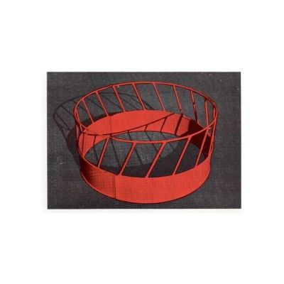 The My-D- Han-D HAY SAVER is constructed ol 1 inch square tubing formed on the diagonal lor greater strength with less weight. The 8 tt. 2 in. diameter HAY SAVER is made into 3 identical 4 ft. high panels. The panels` hinge*pin connection with spring cotters simplifies assembly and allows any section to open for loading. Feeding 3.000 lb. bales requires 4 panels, not only for the diameter, but to allow the HAY SAVER to collapse as the bale is consumed. For feeding silage or square bales, pin 2 panels together to minimize feed loss.