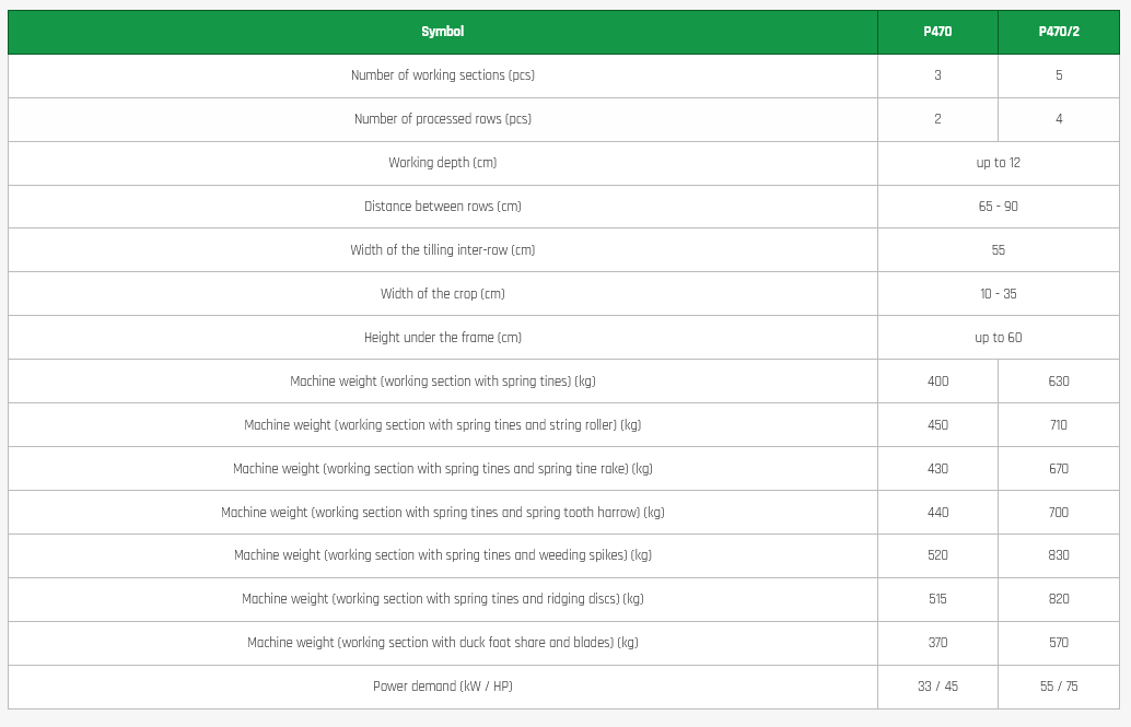 The basic element of the cultivator is a rigid solid frame with the working sections attached. The frame allows inter-row spacing of 65 cm to 90 cm, with a machined inter-row width of 55 cm. An unquestionable advantage of the cultivator is the large height under the frame of up to 60 cm, allowing weeding in the late development of crops, as well as with tall plants. The machine is adapted for aggregation with tractors equipped with Cat II and Cat III suspension systems.