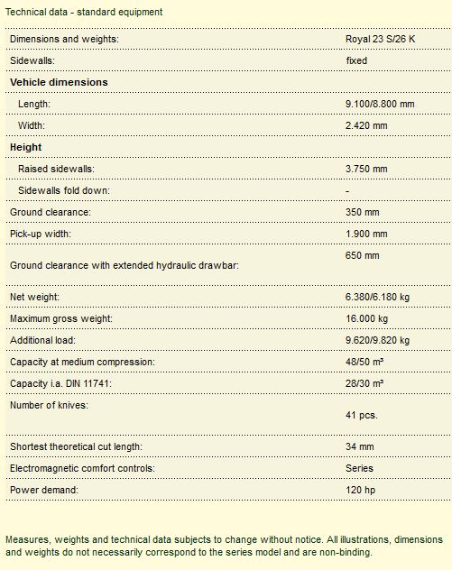 The spacious one, the Royal 26 K offers the manoeuvrability of the 24 K with larger volume, 16 to chassis and standard DLB system. A low drawbar is optionally available. All vehicles can be equipped with 600 tires (22.5").