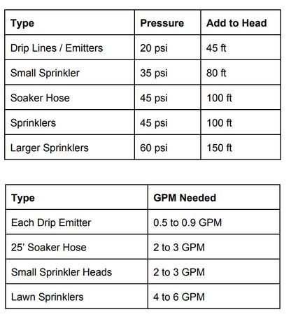 The relationship between pressure in pounds per square inch (psi) and head (in feet) is especially relevant when sizing pumps for irrigation. Each psi is equivalent to 2.31 feet of head. In other words, if you had a water column that was 231 feet tall, you would have 100psi if you opened a valve at the bottom. Common Household pressure is between 35 and 60 psi. As different types of irrigation require lower pressures, Regulators are used to lower this pressure for calibrated water output. The Total Head for a pump is calculated by adding the height the pump needs to push water and the head needed to create pressure. At right are examples for common irrigation types.