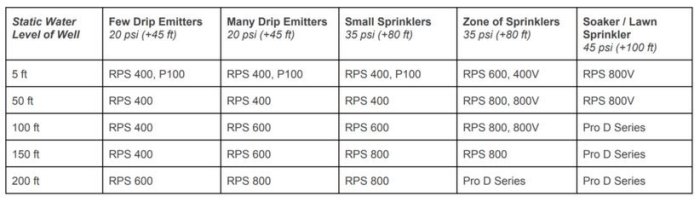 Batteries and a reverse action pressure switch are used to create 24/hr pressure. The pressure switch will wire to the RPS Controller and when the pump fills the pressure tank to the proper psi, it will turn the well pump off. Whenever there is a pressure drop (open valve/timer) the pressure switch will activate the pump to refill the tank and keep the pressure up. The following table shows which RPS Pumps Systems are best suited for Well Pump Pressure. As the head increases (deeper well, higher pressure, steeper hill, etc) generally the volume any pump can generate decreases along its pump curve.