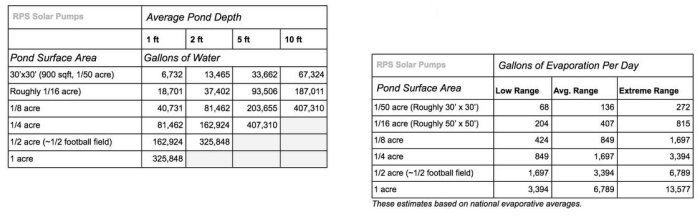 To calculate the days required to fill a pond with your solar pump, divide the numbers in the table on the right by the estimated Gallons Per Day for your selected pump (assuming your well can support that GPM). If you want to run supplement solar pump with a generator for the first few days it will fill 3 to 4 times faster.
